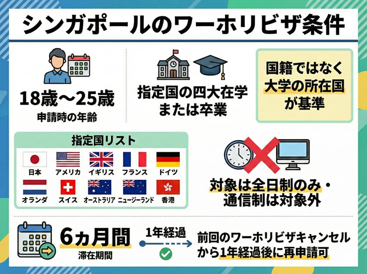 しかし外国の青年がシンガポールで一定期間の就労を認められる制度であるため、学歴の制限はありますが一般のワーキングホリデーと大きな違いはありません。そのため弊社では「ワーキングホリデー」「ワーホリ」の名称を採用しています。